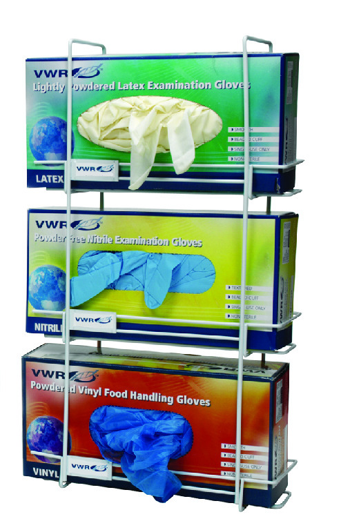 Epoxy-coated steel wire racks are designed to hold most major brands of glove boxes. You can choose from a single-box holder or a three-box holder. The steel wire racks are compatible with most major glove box brands. They come supplied with wall-mounting screws. We offer two options: * A single-box holder measuring 14 × 10.2 × 20.8 cm (5½ × 4 × 8³⁄₁₆") with a capacity of one box, available under Cat. No. 89011-726. * A three-box holder measuring 9.6 × 25 × 43.2 cm (3¾ × 9¹³⁄₁₆ × 17") with a capacity of three boxes, available under Cat. No. 89011-728.