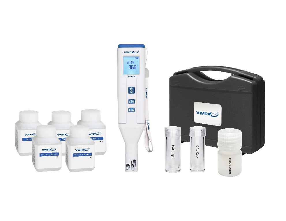 Here is the corrected text: Model: E-M100. The VWR 100-series multi-parameter pocket tester is a versatile system that provides pH, conductivity, and ORP measurements with a single tester. The easy-to-use VWR M100 multi-parameter pocket tester offers the versatility of multiple measurement parameters in a single tester. The rugged carrying case allows you to easily transport the pocket tester, buffers, and accessories to any location. You can easily switch out the electrode to help prolong the life of the pocket tester. • High-resolution LCD display • Auto and manual HOLD function: Freezes readings on the display for easy and accurate recording • IP67 waterproof • Automatic temperature compensation capabilities • Backlight adjustment and automatic shutdown: Extends battery service life • Replaceable electrode Tester includes: carrying case, wrist strap, pH buffers (4.00 and 10.01), conductivity standards (1413 µS/cm and 12.85 mS/cm), ORP calibration solution (222 mV), calibration bottles, and AAA batteries (4).
