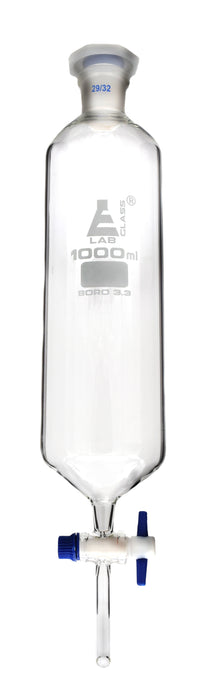 1000ml capacity. This cylindrical dropping funnel is made of high quality Borosilicate glass. Funnel includes a PTFE key stopcock and interchangeable plastic stopper. Socket Size 23/32. Funnel measures 16.5" in length.Eisco Labs Borosilicate glass has the following heat tolerances: Strain Point -515°C | Annealing Point 565°C | Softening Point 820°C.