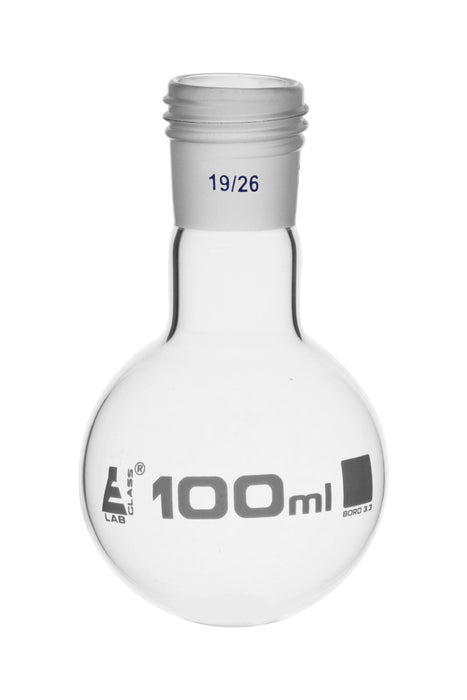 Made of high-quality, heavy-duty borosilicate glass, this 100ml capacity boiling flask features an interchangeable joint with a screw thread (size 19/26). The flask measures 4.5 inches tall and 2.5 inches wide at its widest point. Perfect for any home, school, or professional science laboratory, our products are proudly manufactured by Eisco Labs using state-of-the-art equipment and adhering to the highest standards of quality control. Each product is carefully designed by a team of laboratory professionals and experienced engineers with quality and durability in mind. We use only the highest-grade raw materials and manufacture according to international quality standards to ensure that our products can withstand use in even the toughest laboratory environments.