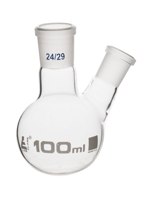 Distilling Flask made of high quality, heavy duty, 3.3 borosilicate glass. 100ml capacity. Oblique neck with 24/29 socket size joint. Side socket is size 19/26. 4" tall, 2.5" wide at widest point. Eisco Labs Borosilicate glass has the following heat tolerances: Strain Point -515°C | Annealing Point 565°C | Softening Point 820°C