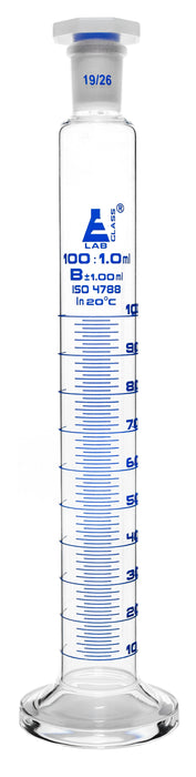 Graduated measuring cylinder made of high quality 3.3 borosilicate glass. Includes interchangeable, polypropylene 19/26 stopper. Class B, ISO 4788 as per DIN 12680. Blue, printed 1.0ml graduation lines, marked every 10ml. Cylinder features a round base for stability. Cylinder measures 11" tall, and 1.25" in diameter. Base measures 2.5" in diameter.