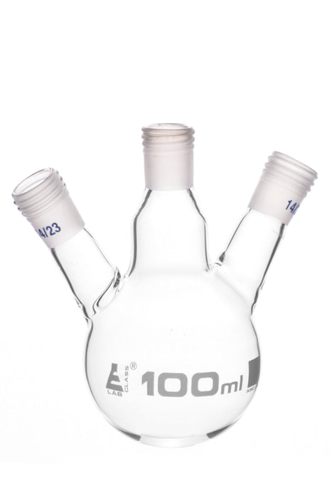100ml capacity distillation flask with three necks. Made of high quality, heavy duty borosilicate glass. Interchangeable, screw thread joints. Socket size 14/23. Flask measures 4.5" tall, 2.5" width at the widest point.