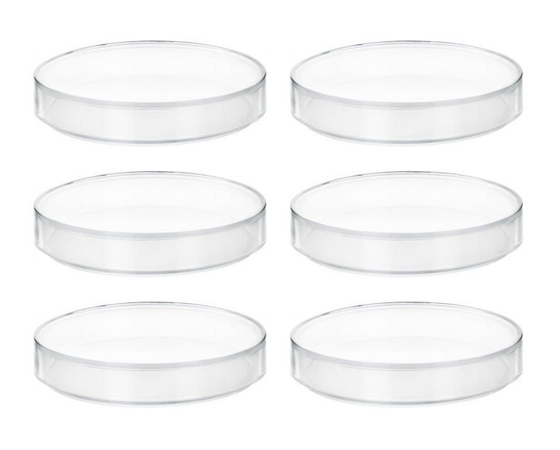 Pack of 6 petri dishes with lids made of high quality, translucent polypropylene plastic. Each dish measures 6" (153mm) in diameter and 0.75" (20mm) deep. Lids measure 3.9" (100mm) in diameter. Unbreakable, non-toxic, non-sterile, multifunctional and ready to use. Excellent for general laboratory applications, including cell culturing, plant germination, precipitate drying and solvent evaporation, home or classroom science experiments, crafting, small storage solutions and more. Petri dishes are reusable and simple to clean. Top rack dishwasher safe.