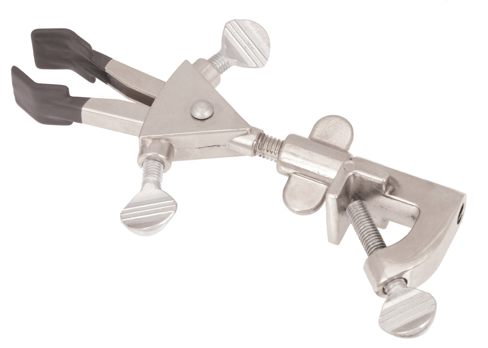 This jumbo size, universal clamp is designed to hold a variety of items. The two, vinyl coated jaws provide a firm grip and are adjustable on both sides with thumbscrews for a wide range of accommodation. Clamp is ideal for use with items that have straight sides, such as burettes, test tubes and flask necks. Accommodates apparatus up to 2.15" (55mm) wide. Overall length is 8". The attached swivel bosshead fits rods measuring up to 21mm in diameter.