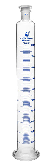 Here is the corrected text: This Class B measuring cylinder is made of high-quality borosilicate 3.3 glass and features an interchangeable 34/35 polypropylene stopper. The cylinder has a capacity of 2000ml, with 20ml subdivision intervals marked every 200ml, and blue graduation lines. It stands 24.75 inches tall, with a round base that measures 5 inches in diameter, providing stability. Eisco Labs' borosilicate glass has the following heat tolerances: strain point -515°C, annealing point 565°C, and softening point 820°C.