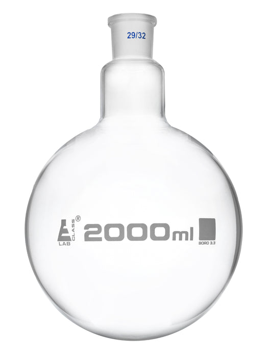 Made of high-quality, heavy-duty 3.3 borosilicate glass, this 2000ml capacity round-bottom boiling flask is perfect for any science or home laboratory. It features a single, interchangeable joint with a 29/32 size socket and stands 10 inches tall, with a diameter of 7 inches at its widest point. The neck diameter measures 50mm. Please note that no stopper is included. Eisco Labs' borosilicate glass has the following heat tolerances: strain point -515°C, annealing point 565°C, and softening point 820°C.
