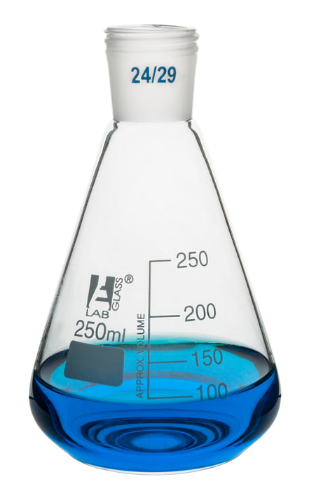250ml capacity boiling flask made of high quality, heavy duty borosilicate glass. Screw thread joint. Socket size 24/29. No stopper included. Flask measures 5.5" tall, and is 3.25" in diameter.