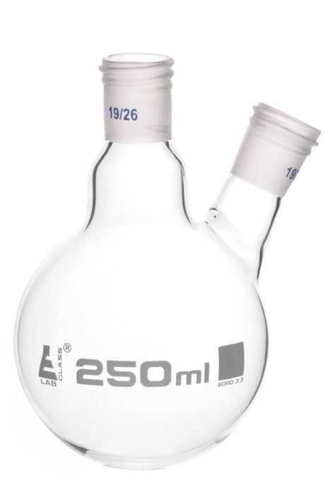 Distillation flask made of high quality, heavy duty borosilicate glass. 250ml capacity with two necks. Interchangeable joints with socket size 19/26. Flask measures 5.5" tall and has a base diameter of 3.5".