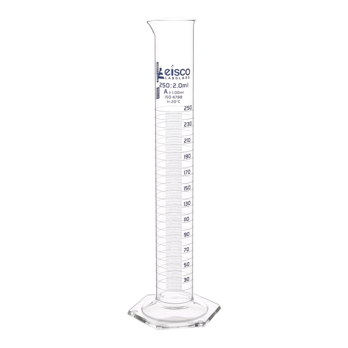 250ml graduated measuring cylinder made of high quality, heavy duty Borosilicate 3.3 glass. Spout for easy pouring, and hexagonal base for extra stability. Class A tolerance, ±1.00ml as per DIN EN ISO 4788 standard. Blue printed graduations and specifications. 2ml subdivisions. Cylinder stands 12.25" tall, with a base measuring 3.6" wide. Inner diameter of cylinder body measures 39mm (1.1"), and outer diameter measures 43mm (1.25"). Autoclavable, with superior chemical durability. Low temperature gradient- can withstand high temperatures & thermal shocks. Eisco Labs Borosilicate glass has the following heat tolerances: Strain Point -515°C | Annealing Point 565°C | Softening Point 820°C. Calibrated to contain.