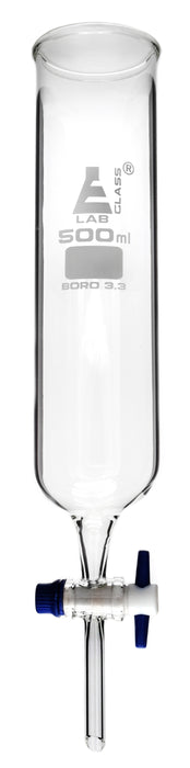 Made of high-quality borosilicate glass, this cylindrical dropping funnel features an open top and a PTFE key stopcock. It has a capacity of 500ml, making it perfect for any science or home laboratory. The funnel measures 14 inches in length and has a diameter of 2.5 inches. The top outer diameter is 2.65 inches, and the inner diameter measures 2.36 inches. Eisco Labs' borosilicate glass has the following heat tolerances: strain point -515°C, annealing point 565°C, and softening point 820°C.