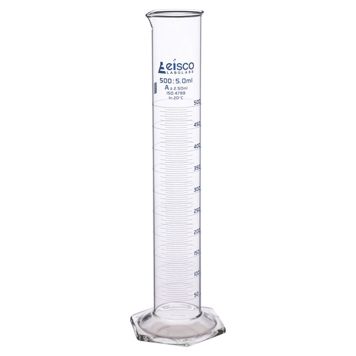 500ml graduated measuring cylinder made of high quality, heavy duty Borosilicate 3.3 glass. Spout for easy pouring, and hexagonal base for extra stability. Class A tolerance, ±2.50ml as per DIN EN ISO 4788 standard. Blue printed graduations and specifications. 5ml subdivisions. Cylinder stands 14.25" tall, with a base measuring 4.5" wide. Inner diameter of cylinder body measures 52mm (2"), and outer diameter measures 55mm (2.2"). Autoclavable, with superior chemical durability. Low temperature gradient- can withstand high temperatures & thermal shocks. Eisco Labs Borosilicate glass has the following heat tolerances: Strain Point -515°C | Annealing Point 565°C | Softening Point 820°C. Calibrated to contain.
