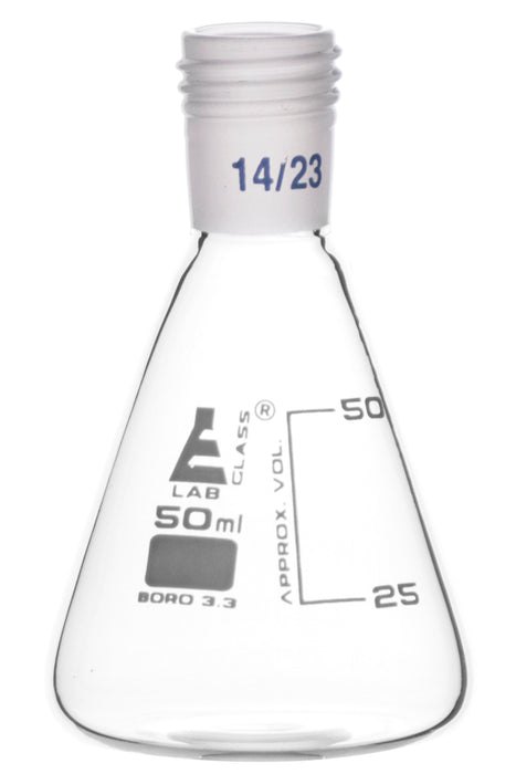 Erlenmeyer flask made of high quality, heavy duty borosilicate glass. 50ml capacity with 25ml graduations. Interchangeable joint with socket size 14/23. Flask measures 3.5" tall and has a base diameter of 2".