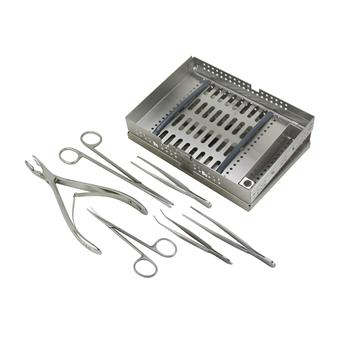 Kit includes:QuantityDescription1Metzenbaum Scissors, Straight, 7 " (17.7 cm)1Metzenbaum Scissors, Curved, 5 " (12.7 cm)1Tissue Forceps, 1 X 2 Teeth, Serrated Handles, 5 " (12.7 cm)1Dressing Forceps, Serrated Handles, 5 " (12.7 cm)1Nugent Utility Forceps, 45° Angled Jaws, 4-1/4 " (10.7 cm)1Blumenthal Oral Rongeur, Jaws at 30° Angle, 7 " (17.7 cm)1Storage Cassette, 6-1/2 " (16.5 cm) X 6-1/4 " (15.8 cm) X 1-1/4 " (3.1 cm)