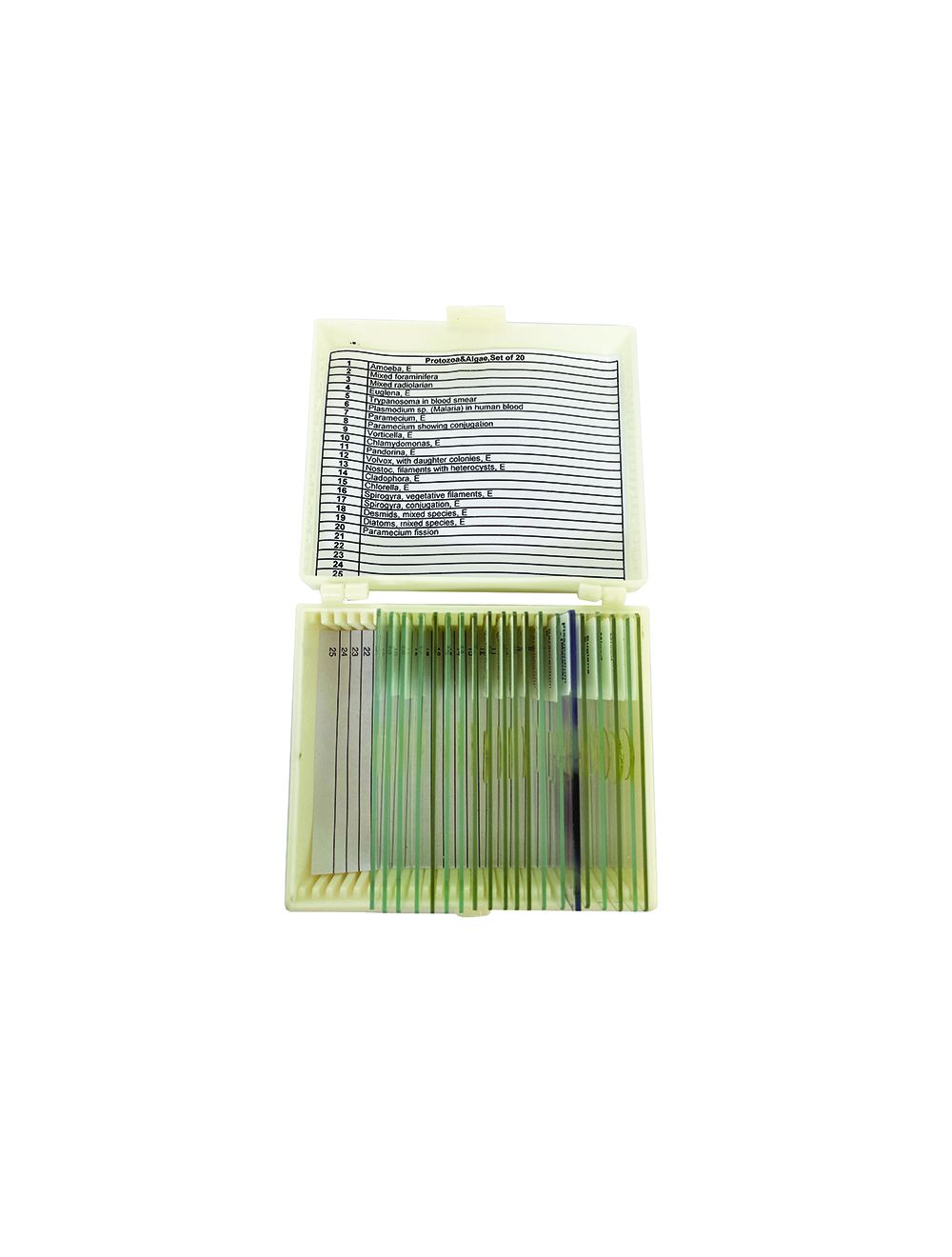 This set of 20 glass-prepared microscope slides is supplied in a plastic case and features a collection of slides specifically designed for the study of protozoa and algae.
