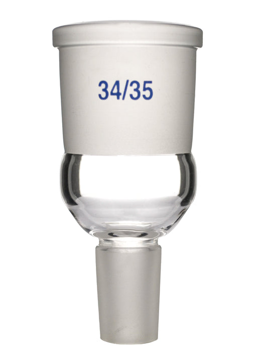 This Expansion Adapter can be used to connect lab equipment with different size joints. Made from high quality, heavy duty borosilicate glass. Socket size 34/35. Cone size 19/26. Overall length of 3.5" .