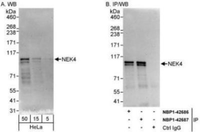 NEK4 Polyclonal specifically detects NEK4 in Human samples. It is validated for Western Blot, Immunohistochemistry, Immunoprecipitation.