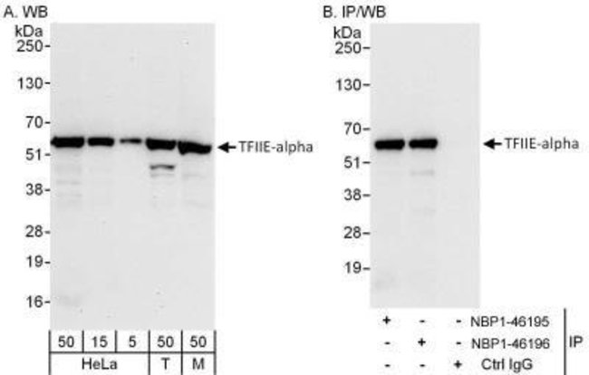 TFIIE-alpha Polyclonal specifically detects TFIIE-alpha in Human, Mouse samples. It is validated for Western Blot, Immunohistochemistry, Immunoprecipitation, Immunohistochemistry-Paraffin.