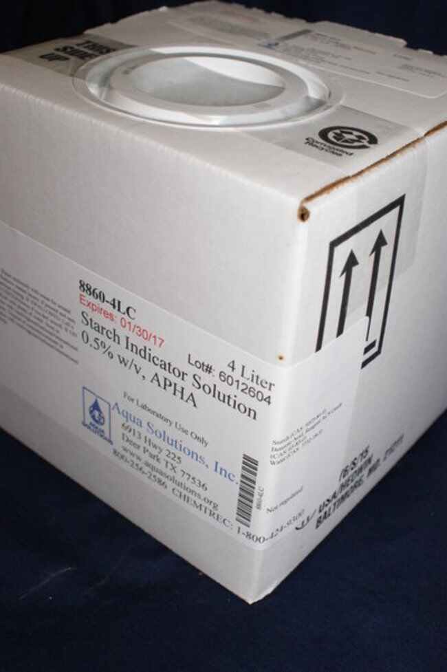 Starch Indicator Solution; 0.5% w/v, APHA Indicator Solution; Clear to slightly turbid solution, odorless; 4L; M.P. ~0 deg. C; B.P. ~100 deg. C; Specific Gravity ~1; Percent Volatile by Volume:> 99%; Stored in a cool dry place