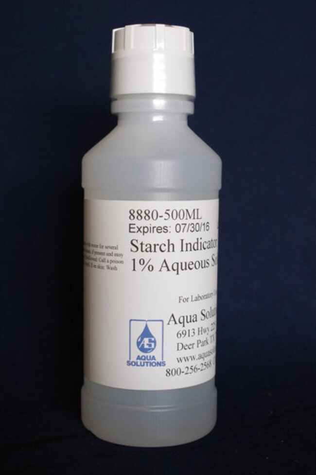 Starch Indicator 1% Aqueous Solution; For General Iodometric Titrations; Clear colorless to turbid solution/no odor; 500mL; M.P. ~0 deg. C; B.P. ~100 deg.C; Specific Gravity ~1; Percent Volatile by Volume: ~99%; Stored in a cool dry place