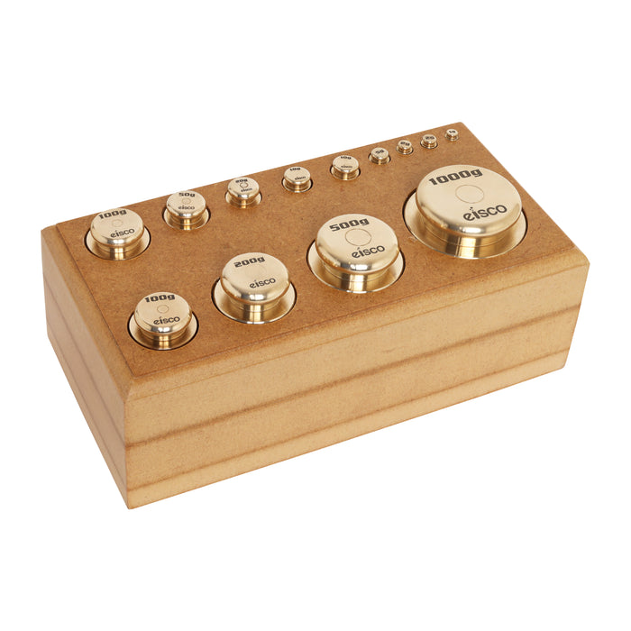 Polished Brass, supplied with wooden block Polished Brass, supplied with wooden block, as illustrated. Capacity 2000 g Includes : 1 x 1000 g 1 x 500 g 1 x 200g 2 x 100 g 1 x 50 g 1 x 20 g 2 x 10 g 1 x 5g 2 x 2 g 1 x 1g