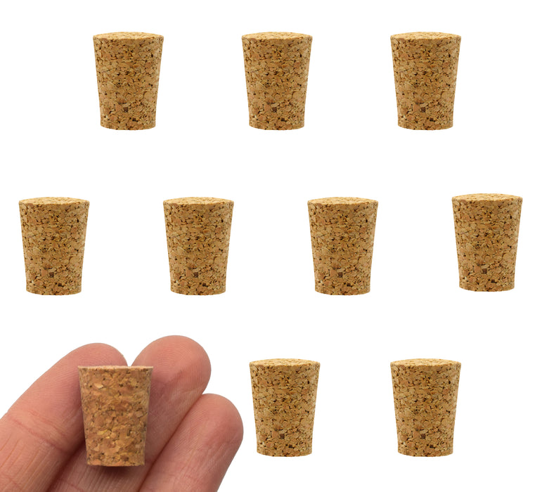 Here is the corrected text: Pack of 10 cork stoppers, size #3. Each stopper measures 19mm in length, with a base diameter of 10mm and a top diameter of 14mm. Made from natural bark material, these corks feature a tapered shape and reliable construction that will not crumble or break easily. Ideal for bottles, flasks, and test tubes with an opening measuring 11-13mm in diameter. Designed for professional laboratory use, they are also suitable for a variety of applications in the classroom, home, and garage.