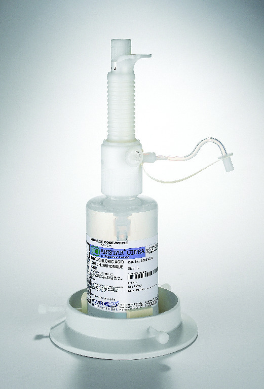 These bottle-top dispensers offer convenience, high chemical resistance, and protection against contamination. They are compatible with all high-purity concentrated acids, including hydrofluoric acid (HF), and are specifically designed to fit ARISTAR ULTRA high-purity acid bottles. The precleaned dispensers are acid-cleaned pre- and post-assembly, and are assembled and packaged under ISO Class 5 (FED-STD-209E Class 100/M3.5) conditions. They also fit ARISTAR PLUS ammonium hydroxide and hydrofluoric acid bottles, dispensing reproducible volumes from 0.5 to 5.0 mL. Each dispenser is calibrated and mechanically tested to ensure it meets volume, precision, and accuracy requirements. All wetted parts, including check valves and seals, are constructed of fluoropolymer PFA or TFM resin.