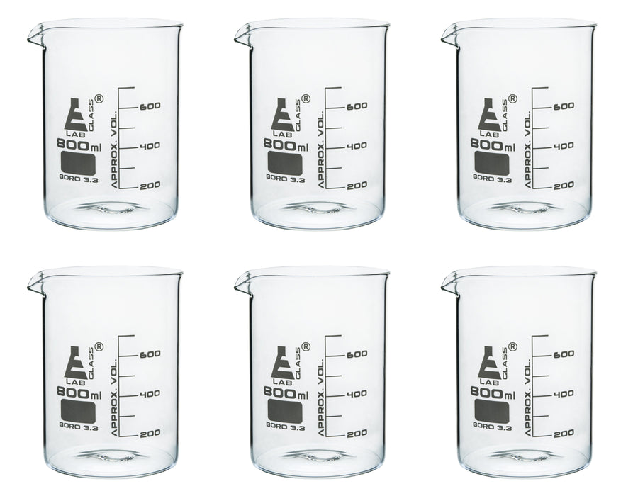 Pack of 6, 800ml capacity, low form beakers made of Borosilicate 3.3 Glass. Beakers feature white graduation lines, marked every 100ml, as per DIN 12231. Spouts for easy pouring. Uniform walls provide excellent strength against breakage.Each beaker stands 5.3" tall, and has an inner diameter of 97.5mm and an outer diameter of 100mm.Eisco Labs Borosilicate glass has the following heat tolerances: Strain Point -515°C | Annealing Point 565°C | Softening Point 820°C.Eisco Labs proudly manufactures its own products using state-of-the-art equipment, and following the highest standards of quality control.