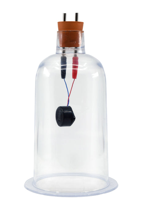 The Bell in Vacuum Experiment is a classic physics demonstration that uses an audible buzzer in a vacuum to demonstrate how sound waves require a medium through which to travel. This experiment provides a great way for students to learn about the properties and dependencies of mechanical waves. The set includes an acrylic bell jar, a rubber stopper fitted with lead plugs, and an electric buzzer. As air is removed from the closed system inside the bell jar, the sound of the buzzer becomes proportionately fainter. To conduct this experiment, you will need a vacuum plate, vacuum pump, and 3-6V DC power source (not supplied). The bell jar measures 10"H x 5.7" in diameter.