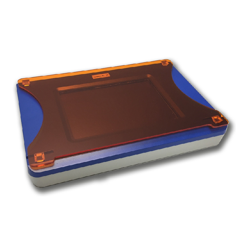 Here is the corrected text: Viewing Glasses for Blue Light Transilluminator, measuring 16L x 8W cm, with a catalog number of 76151-832. Amber Cover for Blue Light Transilluminator, measuring 30L x 20W cm, with a catalog number of 76151-830.