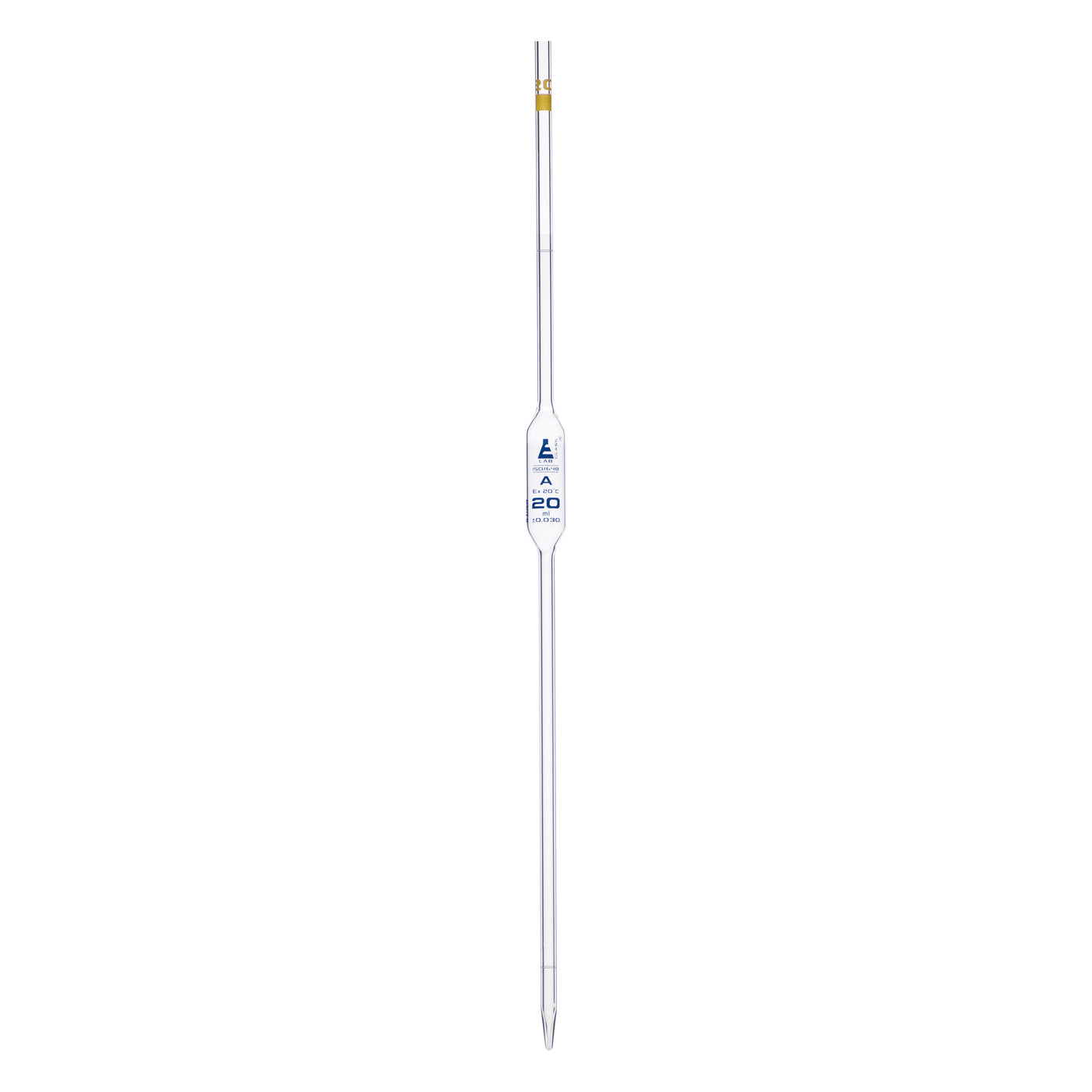 Bulb-form pipette, 20mL, Class A, with a tolerance of ±0.030. This pipette features two white graduation lines and has a yellow color code. It is made from high-quality, heavy-duty borosilicate 3.3 glass.