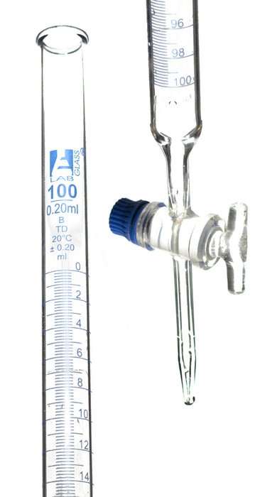 Here is the corrected text: • Premium Class B Borosilicate Burette • Capacity: 100mL with 0.2mL graduations and a tolerance of 0.2mL • The glass key stopcock requires lubrication, offering smooth and authentic control. • Designed for storing liquids in laboratories, this burette can also be used at home or for beer and wine making. • Please clean thoroughly before first use. Eisco Labs' premium borosilicate 3.3 glass burettes have the following heat tolerances: strain point -515°C, annealing point 565°C, and softening point 820°C.