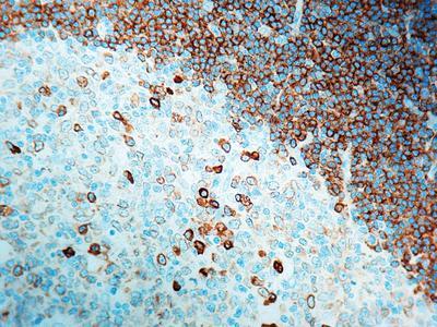 CD79a, B cell^ Clone number HM57, This antibody reacts specifically with B cells at the pre B cell stage. It stains majority of acute leukemias of precursor B cell type, B cell lymphomas and some myelomas. The mb-1 polypeptide along with B29 polypeptide forms an antigen receptor complex on the B cell performing signal transaction and phosphorylation functions.