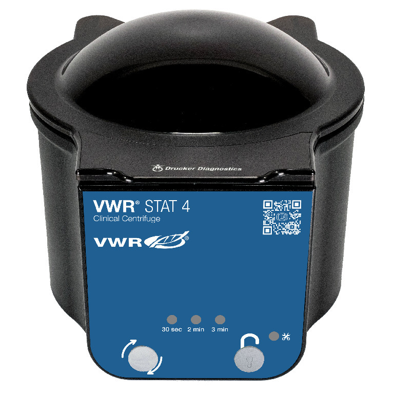 Max. Capacity: 4×75 mm (up to 5 ml) tubes, Max. Speed: 8500 rpm, VWR STAT clinical benchtop centrifuges spin samples in 5 minutes or less for the most urgent chemistry and haematology testing., The VWR STAT 4 is a high-speed benchtop centrifuge designed to rapidly separate fluids in a syringe-type collection tube. Its compact size saves on bench space and allows samples to be moved easily around the laboratory. The simple two-button interface makes it easy to select a preset or program custom STAT cycles based on your IFUs and unique validation needs. Use all three presets, or set and lock to a single cycle for maximum repeatability. Enjoy years of worry-free operation with the VWR STAT 4’s brushless motor, reinforced carbon fibre components, and a two-year calibration guarantee. Enhance lab safety with imbalance protection and a shatterproof lid, which locks until the centrifuge has stopped completely., 02_BulletPoint: 3 convenient presets for common STAT cycles, select using simple two-button interface | LED lid lighting system indicates cycle status: Off when ready, on when running, flashing when done | Max speed 8500 min⁻¹ (rpm)/4400×g | 4 tube capacity (75 mm/6 ml) | Compact centrifuge (7×7×7") to fit with minimal bench space | Fixed angle rotor design for optimal processing of coag and platelet poor plasma | 2 year warranty, 08_Certifications: MET, UKCA., 11_Delivery: Each centrifuge is supplied ready to run with rotor, tube holders, QR code manual and quick start guide., STAT 4, compact set-and-lock STAT centrifuge, with 2-button interface and 3 preset cycles, Rotor type: Fixed angle, Electrical: 100 - 240 VAC, 50/60 Hz, Max. RCF: 4400×g, Dimensions: 17.8×17.8×17.8 cm (7×7×7"), Weight: 2 kg (4.3 lbs.), Cat. No.: 77553-262, Final SAP Desc Link: 4633299, SAP Description Status: Ready, VWR STAT clinical benchtop centrifuges spin samples in 5 minutes or less for the most urgent chemistry and haematology testing., The VWR STAT 4 is a high-speed benchtop centrifuge designed to rapidly separate fluids in a syringe-type collection tube. Its compact size saves on bench space and allows samples to be moved easily around the laboratory. The simple two-button interface makes it easy to select a preset or program custom STAT cycles based on your IFUs and unique validation needs. Use all three presets, or set and lock to a single cycle for maximum repeatability. Enjoy years of worry-free operation with the VWR STAT 4’s brushless motor, reinforced carbon fibre components, and a two-year calibration guarantee. Enhance lab safety with imbalance protection and a shatterproof lid, which locks until the centrifuge has stopped completely., 02_BulletPoint: 3 convenient presets for common STAT cycles, select using simple two-button interface | LED lid lighting system indicates cycle status: Off when ready, on when running, flashing when done | Max speed 8500 min⁻¹ (rpm)/4400×g | 4 tube capacity (75 mm/6 ml) | Compact centrifuge (7×7×7") to fit with minimal bench space | Fixed angle rotor design for optimal processing of coag and platelet poor plasma | 2 year warranty, 08_Certifications: MET, UKCA., 11_Delivery: Each centrifuge is supplied ready to run with rotor, tube holders, QR code manual and quick start guide., Final SAP Desc Link: 4633299, SAP Description Status: Ready