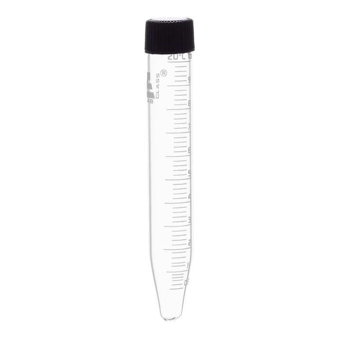 10mL capacity graduated centrifuge tubes are made of high-quality, heavy-duty Borosilicate 3.3 glass, featuring a conical shape and fitted with a screw cap. The tube has a white printed scale with 0.2mL graduations, measuring 100mm (approximately 4 inches) tall, with a body diameter of 15mm (0.6 inches). These tubes are autoclavable, offering superior chemical durability and a low temperature gradient, allowing them to withstand high temperatures and thermal shocks. Eisco Labs' Borosilicate glass has the following heat tolerances: strain point at 515°C, annealing point at 565°C, and softening point at 820°C. Eisco Labs proudly manufactures its own products using state-of-the-art equipment and follows the highest standards of quality control. Each product is carefully designed by a team of laboratory professionals and experienced engineers with quality and durability in mind. They are manufactured with only the highest-grade raw materials, according to international quality standards, ensuring they can withstand use in even the toughest laboratory environments.