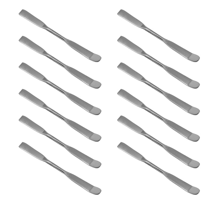 Here is the corrected text: This pack of 12 high-quality, polished stainless steel double-ended laboratory spatulas offers exceptional performance. Each spatula measures a total length of 4 inches, with one end featuring a flat blade and the opposite end bent slightly upward. Both ends measure 38mm in length and are 6mm wide. Designed for professional laboratories, these spatulas are also an ideal choice for science classrooms, household use, restaurants, kitchens, crafts, and painting applications. They are particularly useful for general application, scooping, transferring, and mixing powders and pastes.