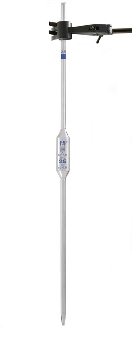 Eisco Labs 25mL Volumetric Pipette is made of borosilicate glass, meeting Class A standards with a tolerance of +/-0.030 as per the DIN ISO 648 standard. It is calibrated for delivery and features blue graduations and markings, along with a blue color code, making it easy to identify volumes. Each pipette is individually wrapped and measures 20.5 inches in length.