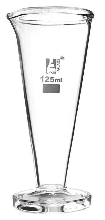 125ml capacity conical measure with spout for easy pouring. Made of high quality Borosilicate glass, with round base, and no graduation lines. Stands 6.5" tall.Eisco Labs Borosilicate glass has the following heat tolerances: Strain Point -515°C | Annealing Point 565°C | Softening Point 820°C.