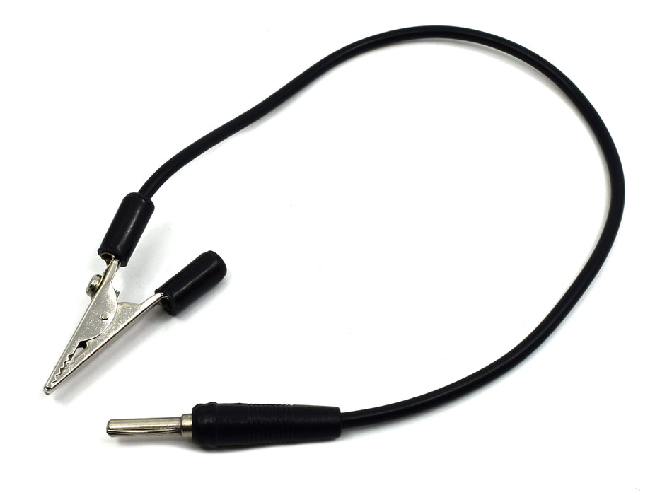 This insulated, black connecting lead has one end featuring an alligator-style clamp and the other end featuring a 4mm plug, measuring 12 inches in length.