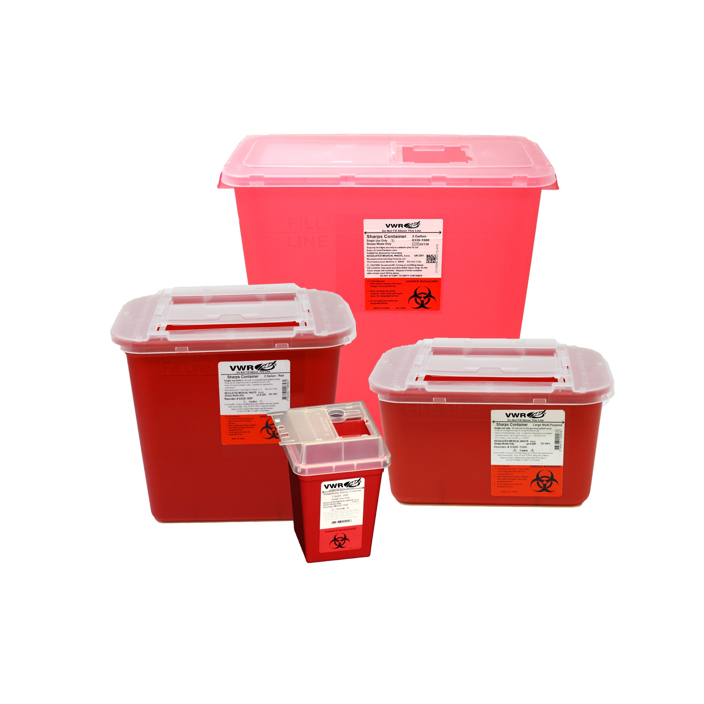 Here is the rewritten text: These containers provide safe disposal of sharps and bio-hazard waste. Their design is ideal for busy professional settings such as laboratories, hospitals, dental offices, and physician offices that require one-handed access to open sharps containers. Choose from four different sharps container designs with sliding lids. The quick-access rotating door on the lid allows users to drop in waste and move the lid to a temporary close position for storage between uses. The slide-to-close lid is intuitive to use, allowing one-handed operation. These containers are designed for high-activity environments and feature both temporary and permanent close positions. Made with translucent colors containing lead-free pigments and no heavy metals, these containers are constructed of puncture- and impact-resistant material. They are safe to autoclave or incinerate and have a stackable design that is lightweight and transportable. Certified by the FDA, these containers meet or exceed FDA standards, including OSHA and EPA requirements for local biohazard waste collection. Available in four sizes: * 1-gallon capacity, red color, dimensions: 10.2L × 7W × 5.6"H, Cat. No.: 76319-796 * 2-gallon capacity, red color, dimensions: 10.2L × 7W × 10.1"H, Cat. No.: 76319-798 * 1-quart capacity, red color, dimensions: 4.4L × 4.4W × 5.6"H, Cat. No.: 76319-794 * 3-gallon capacity, red color, dimensions: 10.3L × 7W × 10.1"H, Cat. No.: 76319-800