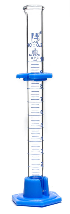This product includes a borosilicate glass graduated cylinder with a plastic guard and a detachable hexagonal base made of plastic. The cylinder has a capacity of 10ml, with graduations of 0.2ml. Eisco Labs' borosilicate glass is known for its heat tolerance, boasting the following properties: Strain Point at 515°C, Annealing Point at 565°C, and Softening Point at 820°C.