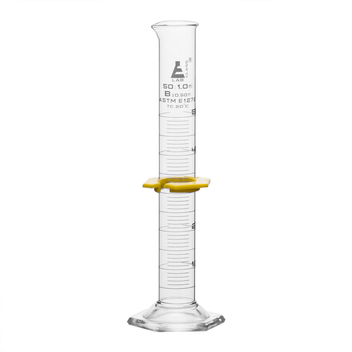 ull; 50ML MEASURING CYLINDER || Graduated cylinder with a 50mL capacity, ideal for precise volume measurement in laboratory and educational settings. • HEXAGONAL BASE DESIGN || Features a hexagonal base for added stability, reducing the risk of tipping during use. • INTEGRATED SPOUT || Equipped with a spout for controlled pouring, facilitating accurate liquid transfer in experiments and procedures. • LABORATORY & EDUCATIONAL USE || Suitable for a variety of scientific applications in labs, classrooms, and home experiments. • BOROSILICATE GLASS CONSTRUCTION || Made with durable borosilicate glass and features white graduations for easy reading. The Eisco Labs 50ml Graduated Measuring Cylinder is an essential tool for precise volume measurement in laboratories, classrooms, and home experiments. With a hexagonal base for stability and an integrated spout for controlled pouring, this cylinder is designed for ease of use in various scientific applications. The white graduations ensure accurate readings, making it a reliable choice for professionals and students alike.