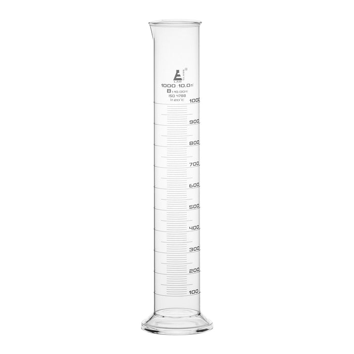 Here is the corrected text: The Eisco Labs 1000ml Graduated Measuring Cylinder is a versatile labware tool designed for accurate liquid measurement. Made from borosilicate glass, it features a round base for stability and a spout for easy pouring. The cylinder has a capacity of 1000ml and meets Class B accuracy standards, making it suitable for precise liquid measurement in laboratory settings. Its clear white graduations provide easy-to-read volume measurements, ideal for use in scientific experiments. Designed with stability and convenience in mind, the cylinder's round base and spout ensure accurate and spill-free pouring of liquids. It is an essential tool for chemistry labs, educational institutions, and research facilities, suitable for a wide range of scientific applications.