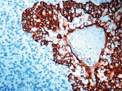 Cytokeratin (45,46,56.4 kD)^ Clone number MNF116, This antibody recognizes cytokeratin polypeptides ranging from 40 through 58kD, corresponding to cytokeratins 5, 6, 8,17 and 19. It shows a broad pattern of reactivity with human epithelial tissues from simple glandular epithelia to stratified squamous epithelia.