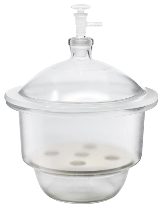 Made from heavy-duty borosilicate 3.3 glass, this vacuum desiccator features an inner chamber diameter of 20cm (7.9"). It can hold a full vacuum of 740mm Hg at room temperature for 24 hours and remains airtight even when not under vacuum. The desiccator includes a 194mm (7.6") porcelain sieve plate that rests on the 205mm (8.1") inner diameter chamber bottom, as well as a removable glass stopcock with a side arm, allowing controlled air entrance while preventing unnecessary turbulence. With superior chemical durability and heat tolerance, this product is designed for professional laboratories but is also an ideal choice for science classrooms and household use. The chamber, lid, and stopcock are constructed from high-quality semi-frosted borosilicate 3.3 glass. The removable glass stopcock with side arm measures 105mm H x 56mm W. The overall desiccator size without the stopcock is 265mm (10.4") O.D. x 281mm (11.1") H. This autoclavable desiccator features a low temperature gradient and can withstand high temperatures and thermal shocks. Eisco Labs Borosilicate glass has the following heat tolerances: Strain Point, 515°C; Annealing Point, 565°C; Softening Point, 820°C.