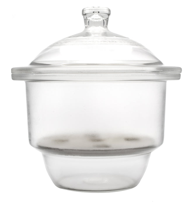 Desiccator made of high quality, heavy duty, 3.3 borosilicate glass. Features a knob cover, and an unglazed, porcelain plate measuring 7.5" in diameter, with five holes, each 1". Assembled, the desiccator measures 11" tall, and 10.5" wide. The base has a diameter of 8.5". Eisco Labs Borosilicate glass has the following heat tolerances: Strain Point -515°C | Annealing Point 565°C | Softening Point 820°C.