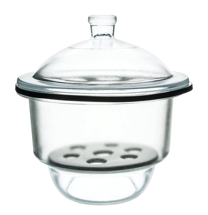 Desiccator made of high quality, heavy duty, borosilicate glass. Features a knob cover. Unglazed porcelain plate measures 25cm (9.8") in diameter and is 0.5" thick. 8.5" tall without the knob cover, 13" tall with the knob cover, and 12" diameter. Great for any school or home laboratory. Eisco Labs Borosilicate glass has the following heat tolerances: O92Strain Point -515°C | Annealing Point 565°C | Softening Point 820°C