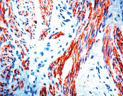 Desmin^ Clone number D33, This antibody reacts with desmin protein of 53 kD. Both striated as well as smooth muscle cells stain well with this antibody. The antibody shows a broad interspecific cross-reactivity i.e. reacts with human, rat, chicken and hamster.