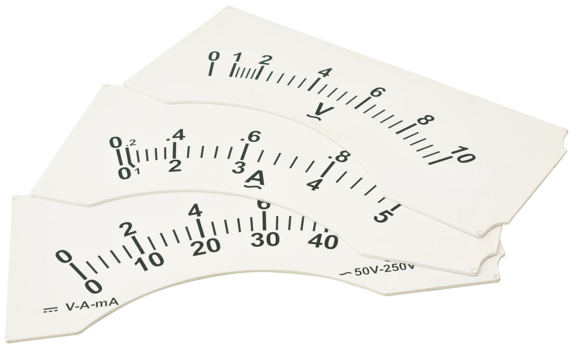 For use with PH-1116, each dial consists of a laminated plastic panel measuring 315 x 115 mm, featuring a sealed molded box at one end that houses the shunt or voltage multiplier suitable for the respective scale.