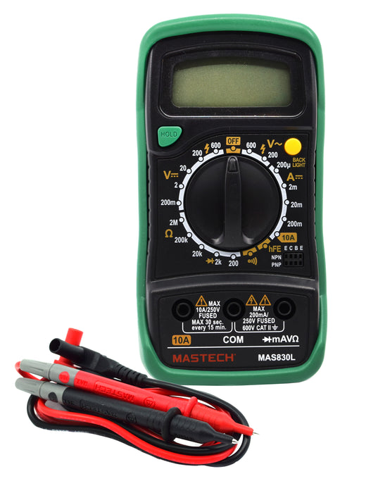 This handheld digital multimeter features an LCD display and a drop-resistant case. It comes with a battery, two testing leads, and an instruction manual. The device is stable and reliable, offering clear readings on its 15mm LCD display. At the core of its circuit design is an LSI double integral A/D converter, which is protected by an overload protection circuit, making it a superior and handy instrument. This multimeter can be used to measure DC and AC voltage, DC current, resistance, test transistors and diodes, and perform in-circuit continuity testing. The unit measures 5.4 inches tall, 2.7 inches wide, and 1.2 inches long.